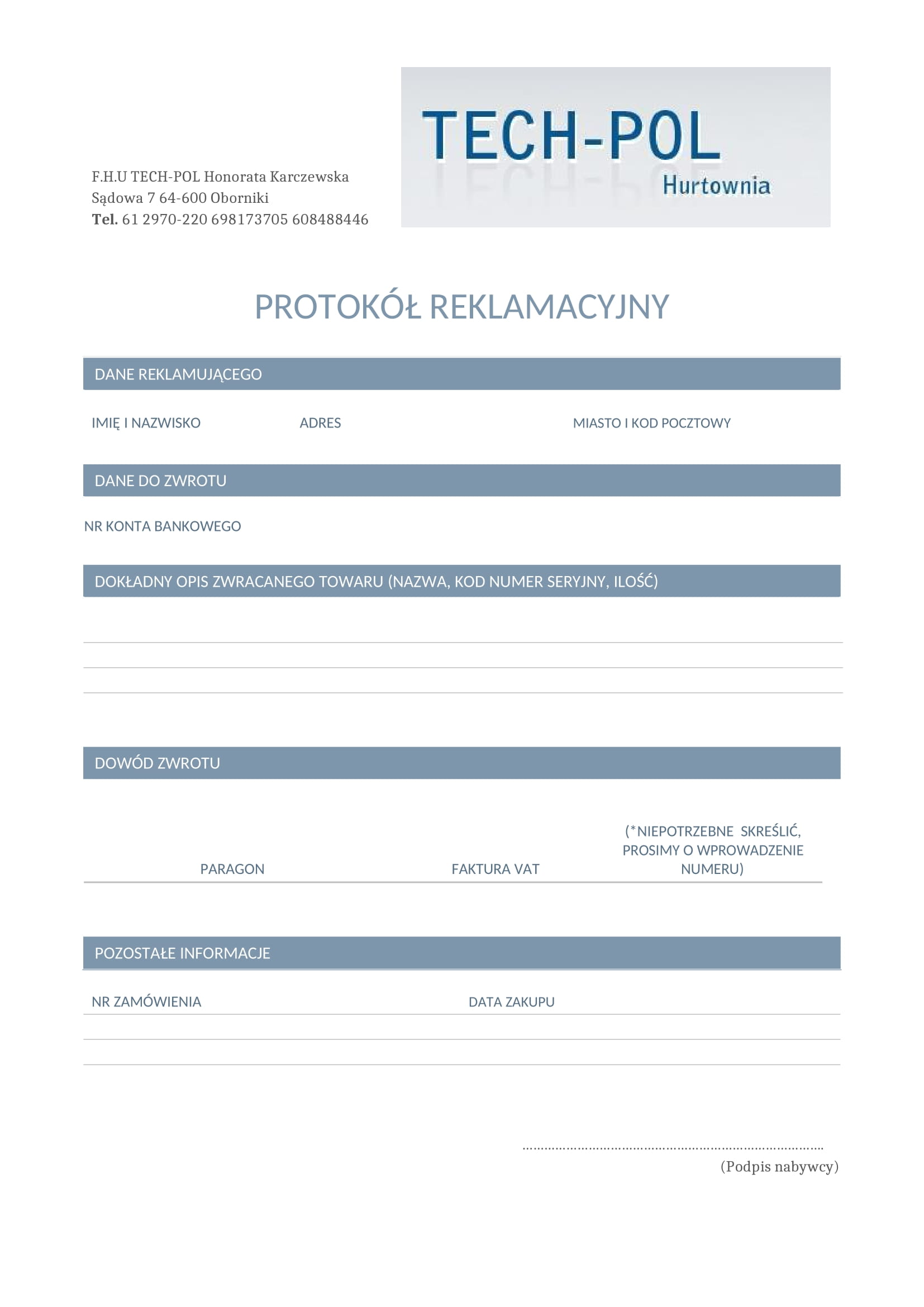 W przypadku zwrotu towaru proszę o uzupełnienie poniższego formularza.